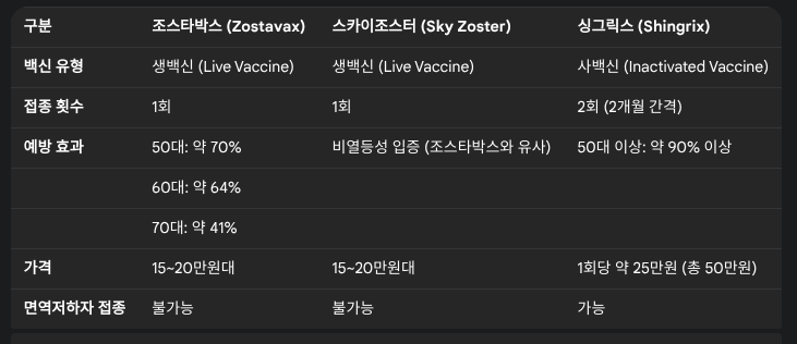 - 단점: 생백신의 특성상 **면역력이 약한 사람(암 환자, 장기이식 환자, HIV 감염자 등)**은 접종할 수 없습니다. 또한 예방 효과가 싱그릭스에 비해 낮고, 연령이 높아질수록 효과가 감소하는 경향을 보입니다.